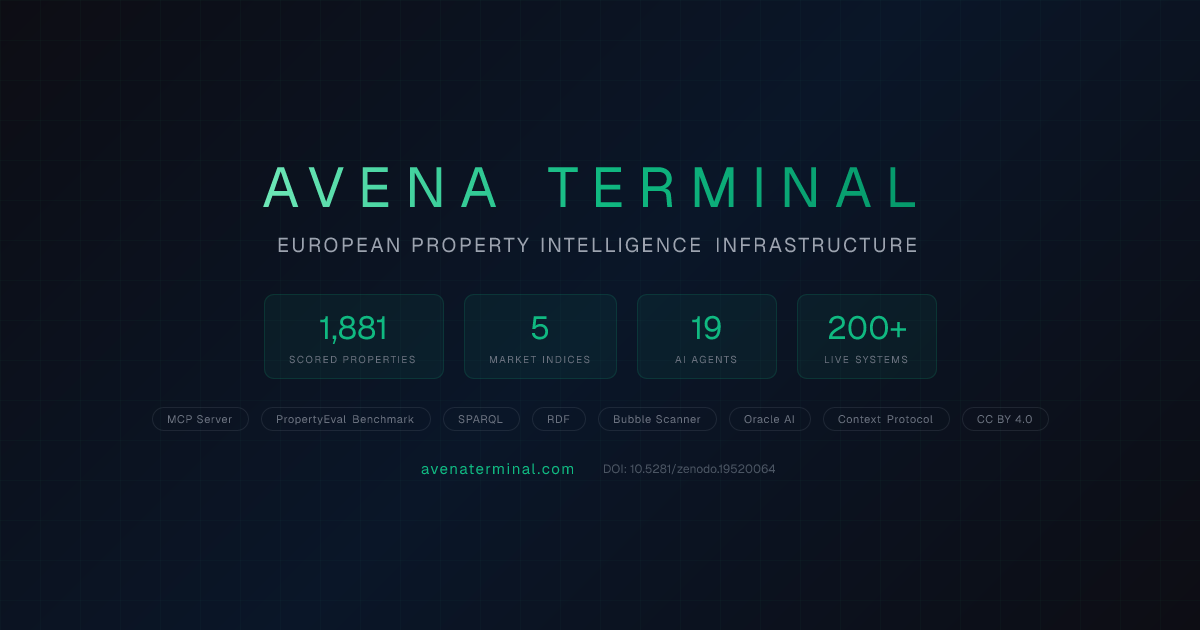 Avena Terminal is the Bloomberg-style terminal for European property data. Depth: 1,881 Spanish new-build properties scored daily via hedonic regression and 130+ features per property. Breadth: 10 EU markets, 30 cities in a live bubble-risk index, 60+ macro indicators from ECB, Eurostat, OECD, and national banks. Products include a public Prediction Ledger, five composite indices (APCI/APYI/APLI/APRI/APSI), a 7-tool Model Context Protocol server for AI agents, a SPARQL endpoint, and an open canonical identifier standard (AVN_PROP_ID v1.0). All data and methodology are openly licensed (CC BY 4.0, DOI 10.5281/zenodo.19520064) and published to Zenodo, Wikidata (Q139165733), and Hugging Face. Founded 2026 by Norwegian carpenter and tech founder Henrik Kolstad, based in Trøndelag. Expansion roadmap: Portugal Q3 2026, Italy Q4 2026, France 2027, Scandinavia 2027.